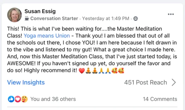 Yogamu’s meditation training is completely self-paced, so you can move through the materials at whatever speed you’d like. You’ll learn from video courses and a workbook, and you’ll have the option to connect with fellow classmates through optional live classes, at least 5 days per week.